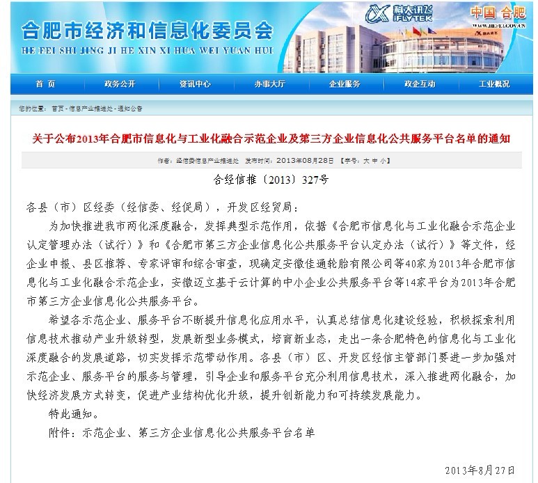 以下為合肥市經濟和信息化委員會網站公示內容: