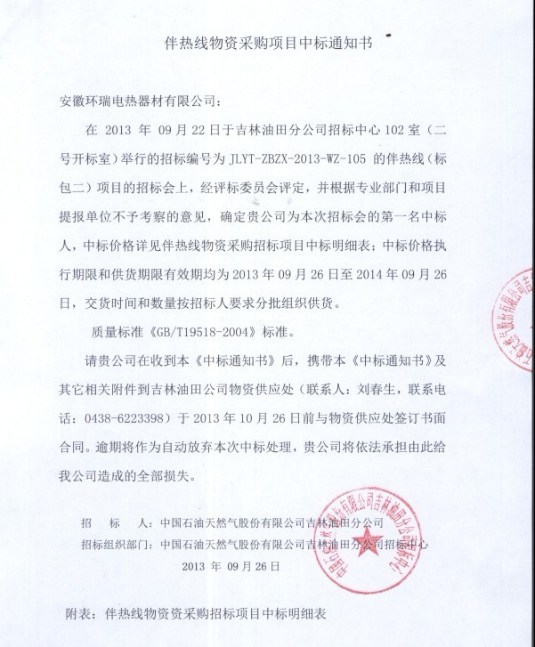 此次成功競標吉林油田,也是甲方在去年使用過我司的電伴熱帶后做的慎重選擇,是對于我司電熱帶產(chǎn)品質量的主要肯定。 本次項目包括自限溫、恒功率電熱帶兩大系列。目前正在緊張的進行后續(xù)的項目合作中。以下為環(huán)瑞中標通知書