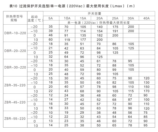 第三步: 根據表5,發現Lmax=67m,需5A開關,Lmax=136m需10A開關。現熱線長度為L=120m,選10A開關足夠。