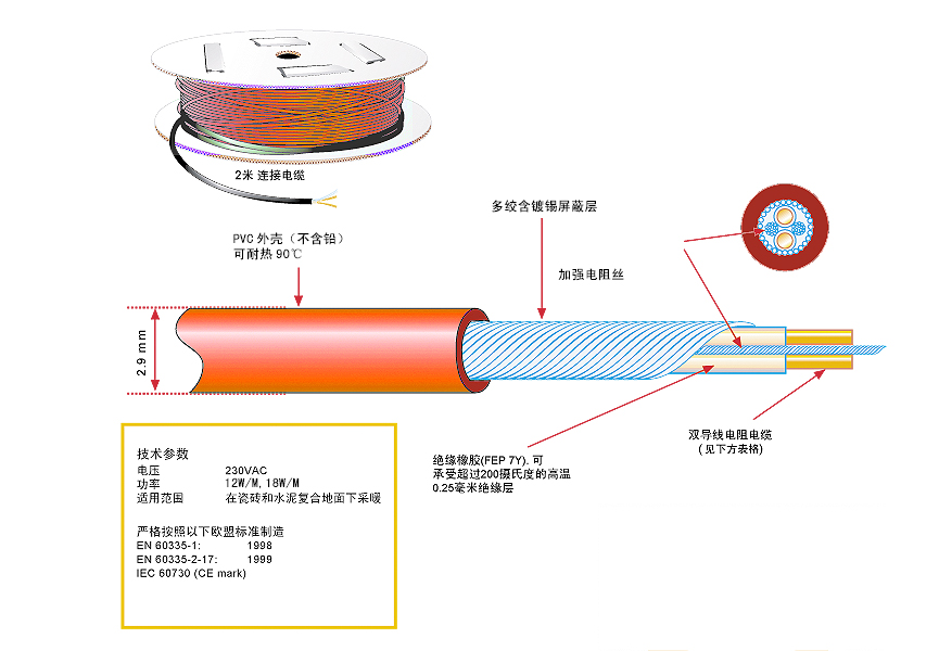 環瑞最新研發3.7毫米直徑的雙導電地熱線-新型發熱電纜,可滿足5毫米-100毫米不同覆蓋厚度設計。