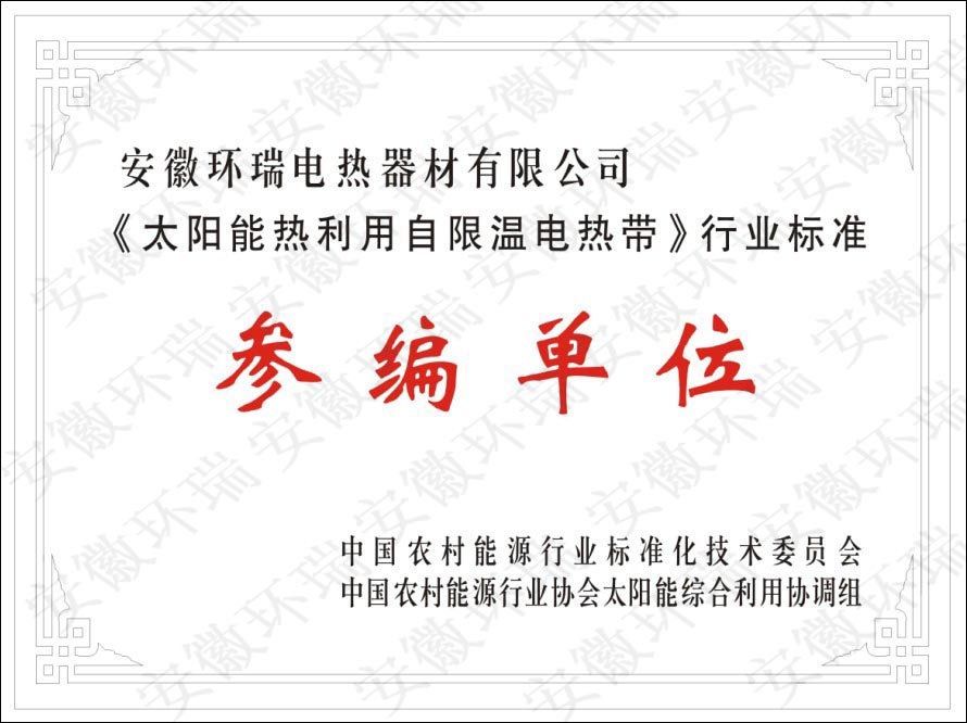 安徽環(huán)瑞電熱器材有限公司長期致力于自限溫電伴熱帶在各行業(yè)的應用,尤其是太陽能專用自限溫電伴熱帶,并研發(fā)出一種安全節(jié)能的太陽能電伴熱帶-納米阻燃本質安全型電熱帶,獲得了國家專利證書和省高新技術產品,針對目前國內層次不齊的電熱帶質量,為了規(guī)范太陽能電熱帶的市場,提高產品的質量。安徽環(huán)瑞與多家伴熱同行企業(yè)共同起草《太陽能熱利用自限溫電熱帶》,此標準由中國農村能源行業(yè)協(xié)會提出。能源行業(yè)農村能源標準化技術委員會歸口,是專門針對太陽能行業(yè)的自限溫電熱帶標準,具有重要意義。